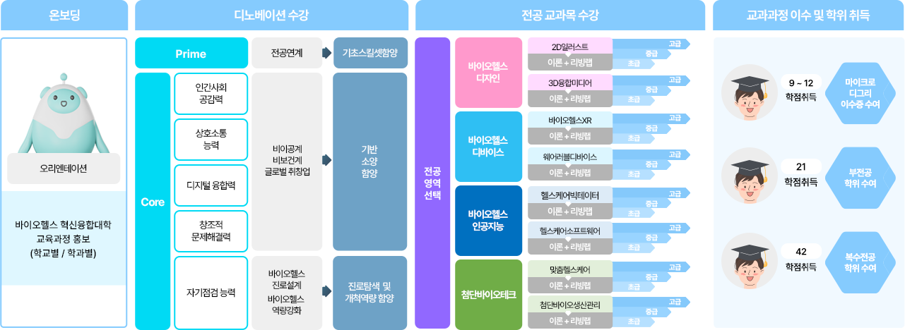 - 바이오헬스 혁신융합대학의 교육과정은 여러분의 진로와 역량에 맞춘 맞춤형 성장 로드맵입니다.